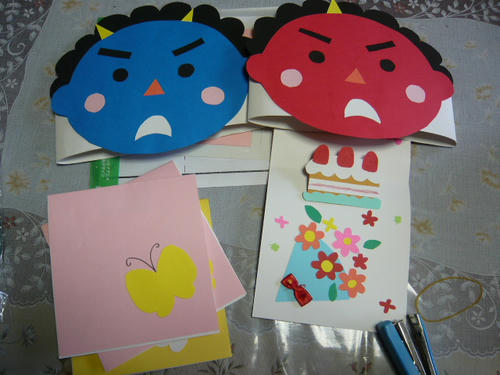 なんかくじ引きの箱作ったり、鬼のお面作ったり、飛び出す誕生日カード作ったり…